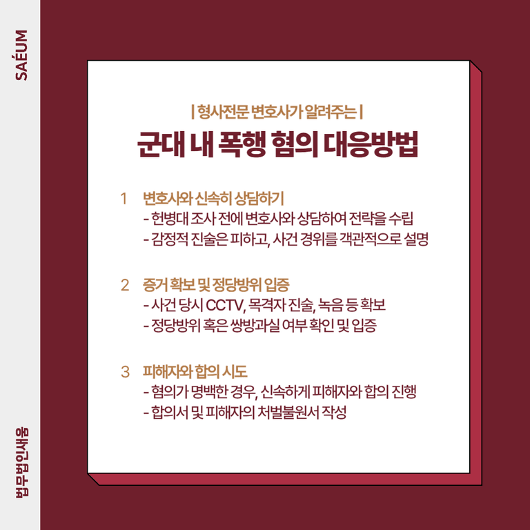 만약 군인 폭행 혐의로 조사를 받게 되었다면, 신속하게 정확한 대응 전략을 마련해야 합니다. 군형법이 적용되는 폭행 사건의 특성과 대처 방법을 자세히 살펴보겠습니다.