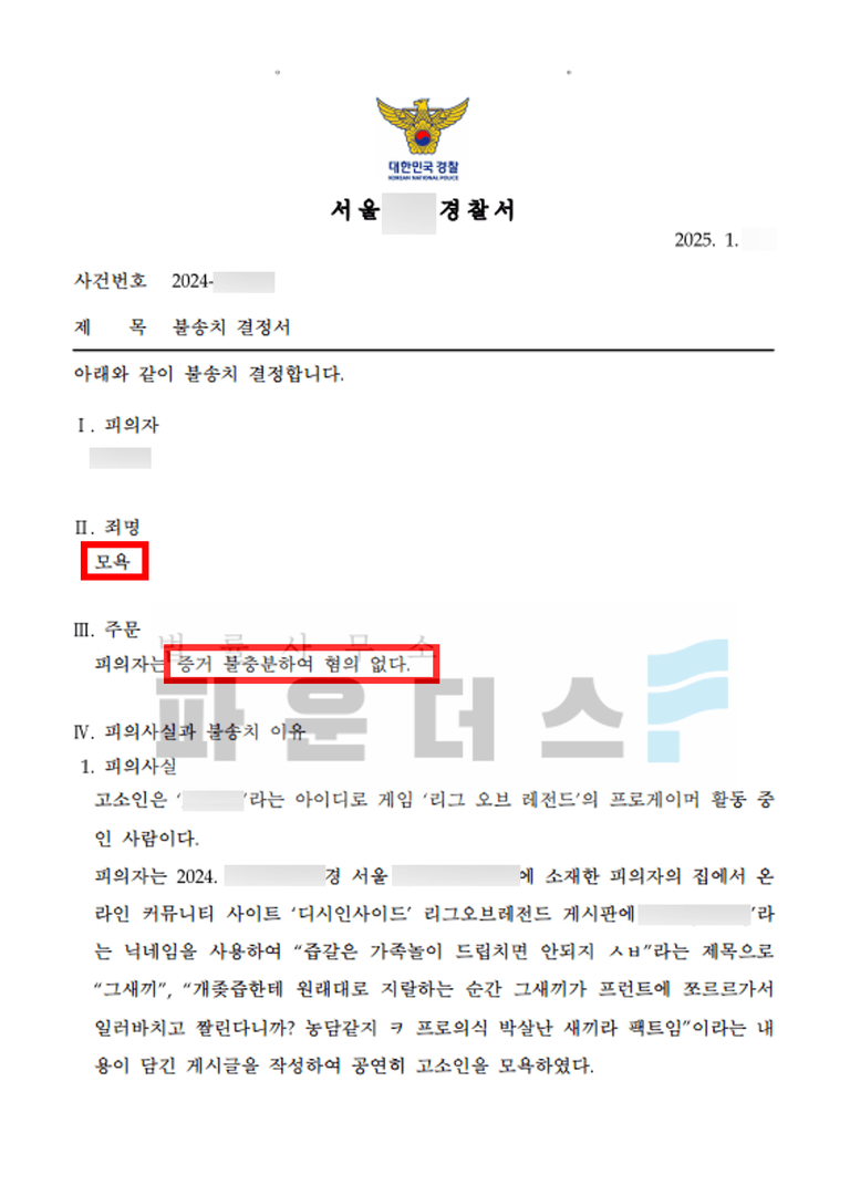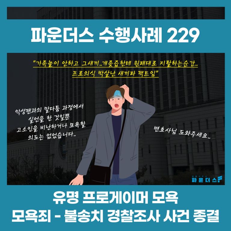 그 결과 의뢰인은 유명 프로게이머를 향한 모욕성 발언으로 연루된 모욕 혐의에서 불송치 결정으로 경찰단계에서 사건을 마무리 지을 수 있었습니다.