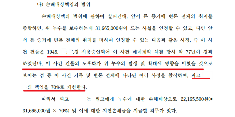 구체적으로 법원은 원고가 주장한 누수 피해에 대하여는 '건물의 노후화가 누수 발생 및 확대에 영향을 미쳤을 것으로 보이는 점을 고려하여 의뢰인의 책임을 70%로 제한한다'고 판단하였습니다.