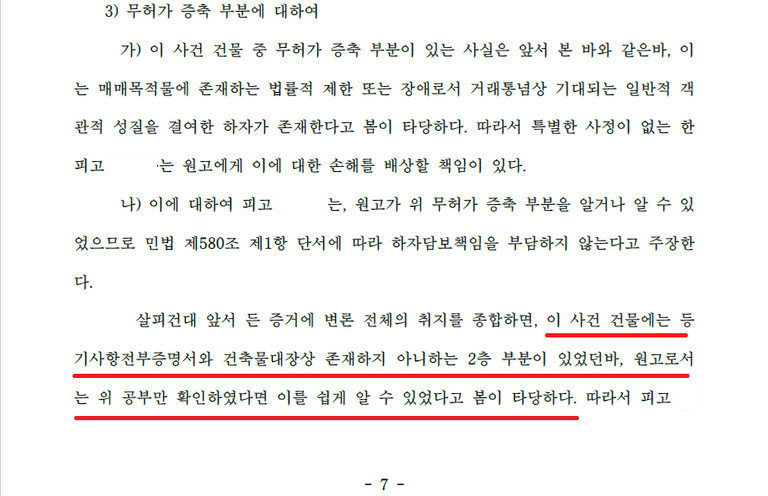 그리고 무허가 증축 부분 손해에 대해서는 '이 사건 건물에는 등기사항전부증명서와 건축물대장상 존재하지 아니하는 2층 부분이 있었던 바, 원고로서는 공부만 확인하였다면 이를 쉽게 알 수 있었다고 봄이 타당하다. 따라서 피고는 무허가 증축 부분에 대한 하자담보책임을 부담하지 않는다고 할 것이다'고 판단하면서 피고(의뢰인)의 배상책임을 상당 부분 제한하였습니다.