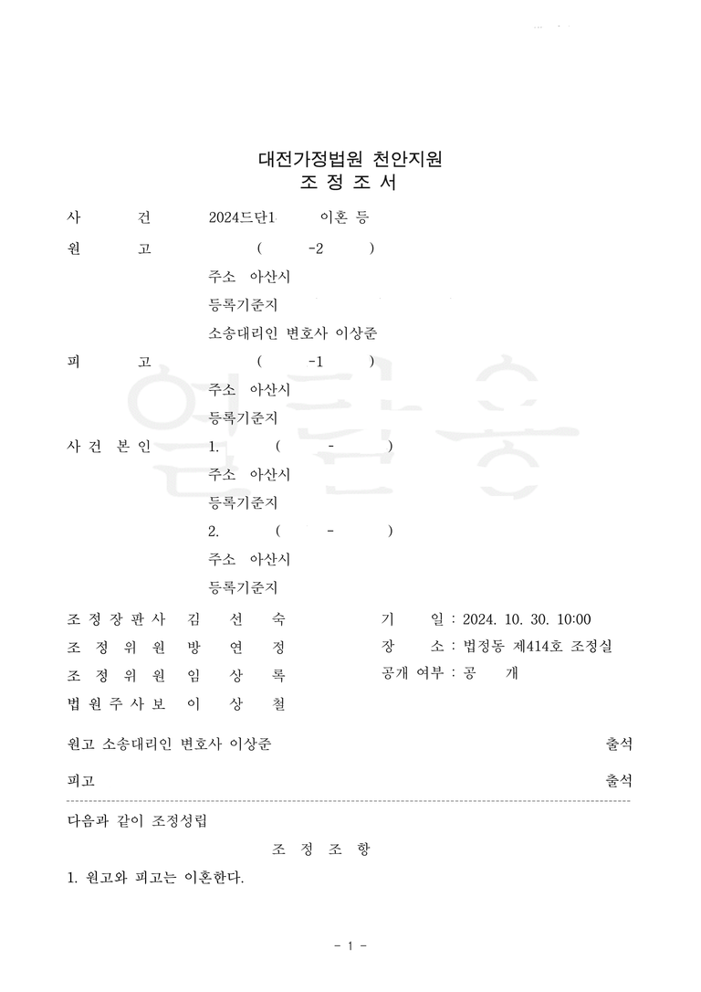 저는 조정기일에 남편과 만났고, 아내가 이미 위자료, 재산분할금을 모두 받았으므로 위자료, 재산분할은 없는 것으로 합의하였습니다. 이미 조정기일 전에 합의가 완료된 상태였기 때문에 조정은 5분 만에 끝났습니다.
