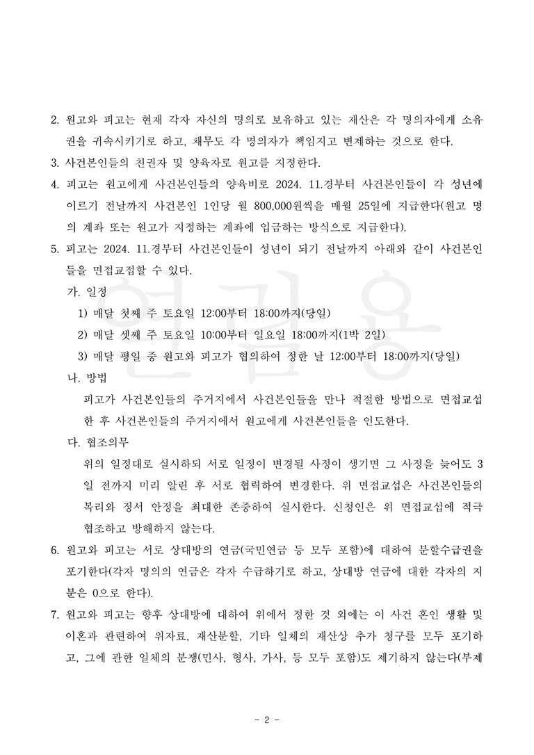 소장이 남편에게 송달된 다음날 저는 남편에게 전화하여 소송이 진행되면, 제가 청구한 대로 판결이 내려질 것이라고 말하며 아이와 아내를 위해 빨리 합의하자고 제안했습니다.