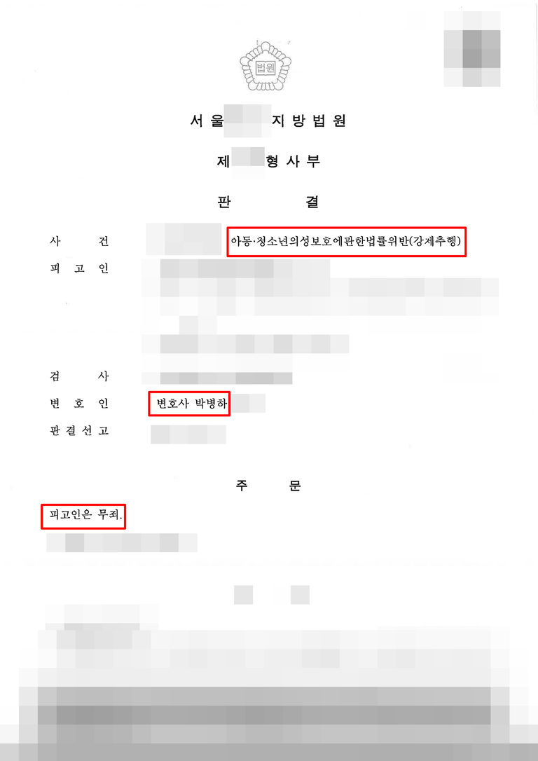법원은 박병하 변호사의 변호 내용 및 증인신문 내용 등을 바탕으로 무죄 주장을 모두 받아들여 의뢰인이 피해자를 강제추행하여 아동·청소년의 성보호에 관한 법률을 위반했다는 범죄사실에 대해 무죄를 선고하였습니다.