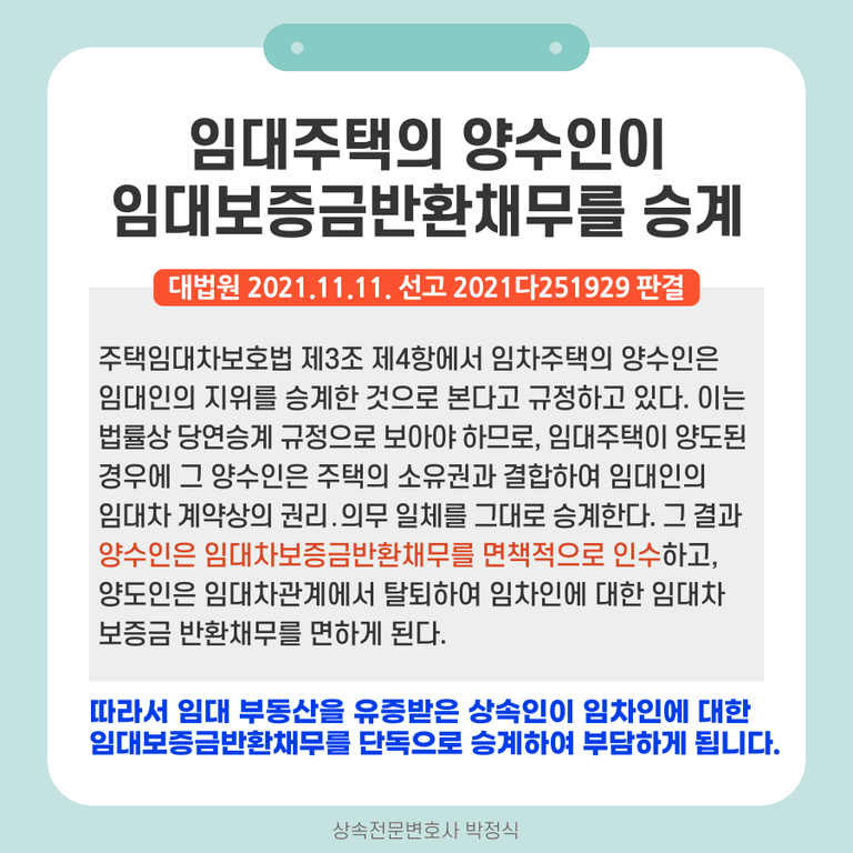 이는 대법원에서 "주택임대차보호법 제3조 제4항은 주택의 인도와 주민등록의 대항요건을 갖춘 임대차의 목적이 된 임차주택의 양수인은 임대인의 지위를 승계한 것으로 본다고 규정하고 있다. 이는 법률상 당연승계 규정으로 보아야 하므로, 임대주택이 양도된 경우에 그 양수인은 주택의 소유권과 결합하여 임대인의 임대차 계약상의 권리․의무 일체를 그대로 승계한다. 그 결과 양수인은 임대차보증금반환채무를 면책적으로 인수하고, 양도인은 임대차관계에서 탈퇴하여 임차인에 대한 임대차보증금 반환채무를 면하게 된다"라고 판시(대법원 2021.11.11. 선고 2021다251929 판결)하고 있으므로, 특정상속인이 유증받은 부동산의 임대보증금반환채무는 그 부동산을 유증받은 상속인이 단독으로 부담하여야 하기 때문입니다.