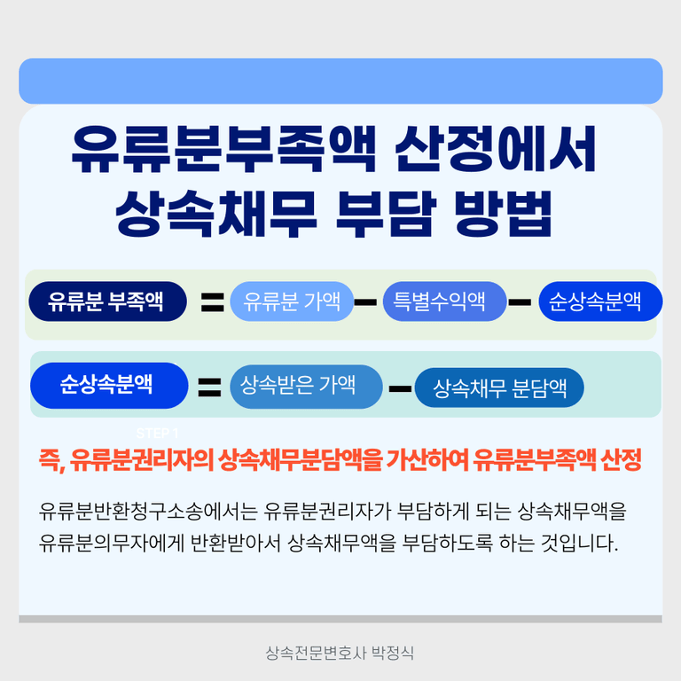 위 계산식에서 유류분가액에서 공제하여야 하는 "순상속분액(D)"은, 유류분권리자가 "실제로 상속받은 가액"에서 유류분권리자의 "상속채무분담액"을 공제하여 계산하게 되므로, 실제로 유류분권리자의 상속채부분담액이 플러스(+) 되는 것입니다.