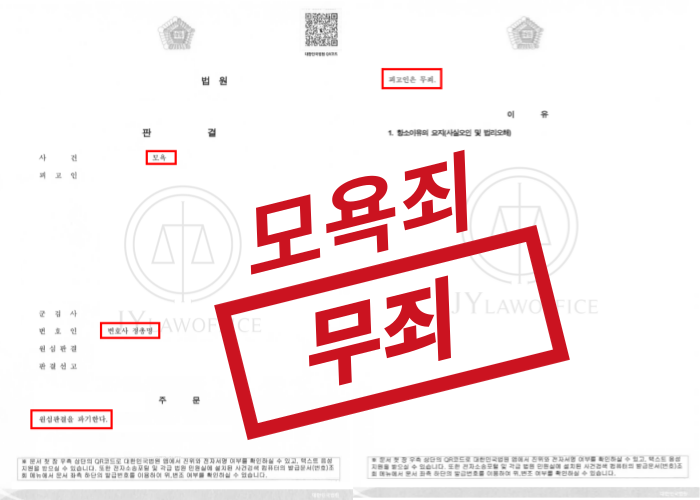 그 결과, 의뢰인은 1심 공판에서 유죄 판결을 받았지만, 이후 진행한 항소심에서 이와 같은 본 형사전문변호사의 조력을 통해 무죄를 선고받고, 모욕죄 혐의를 벗으며, 무사히 사건을 종결시킬 수 있었습니다.