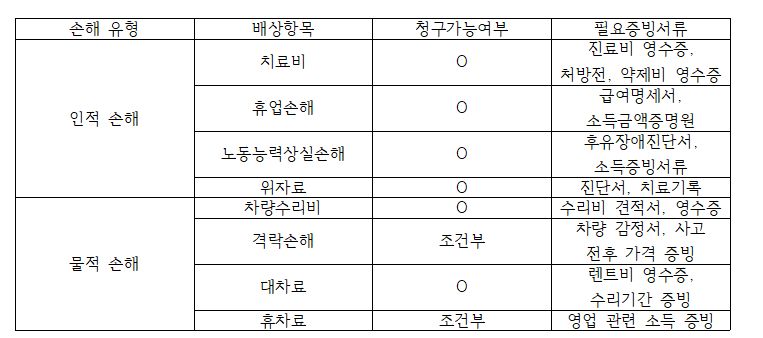 치료비 + 휴업손해 + 노동능력상실손해 + 위자료 + 차량 관련 비용을 청구할 수 있으나 보험사가 치료비 + 위자료만을 지급하려 할 수도 있습니다.