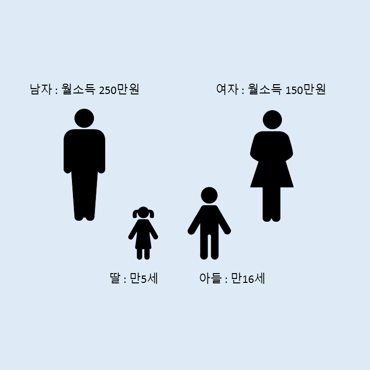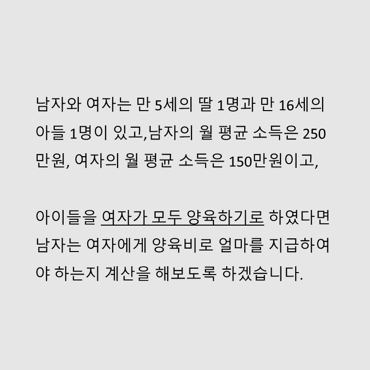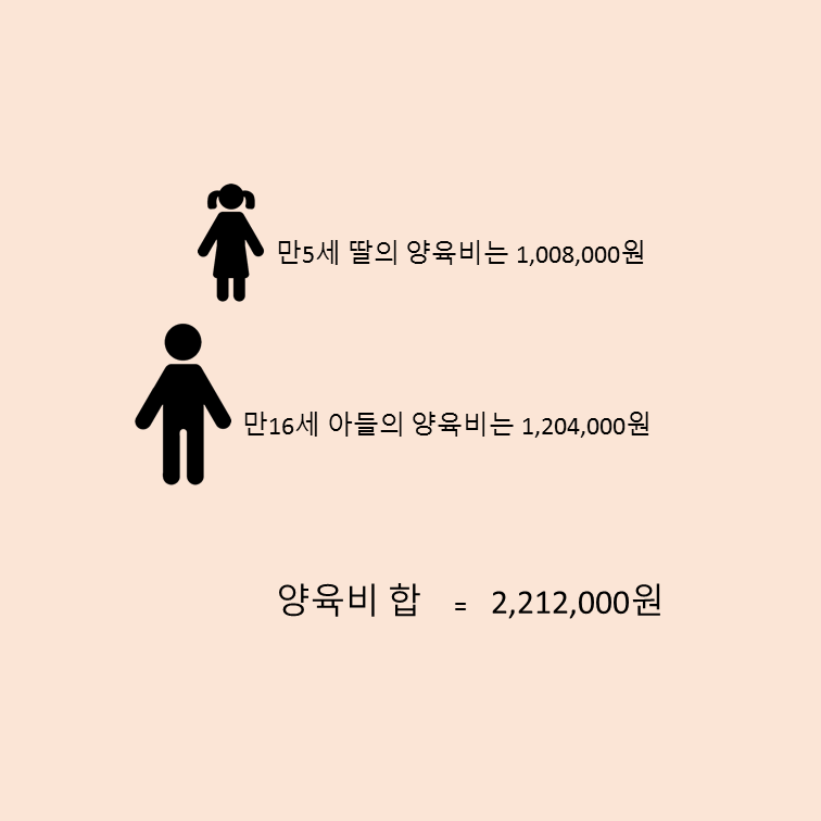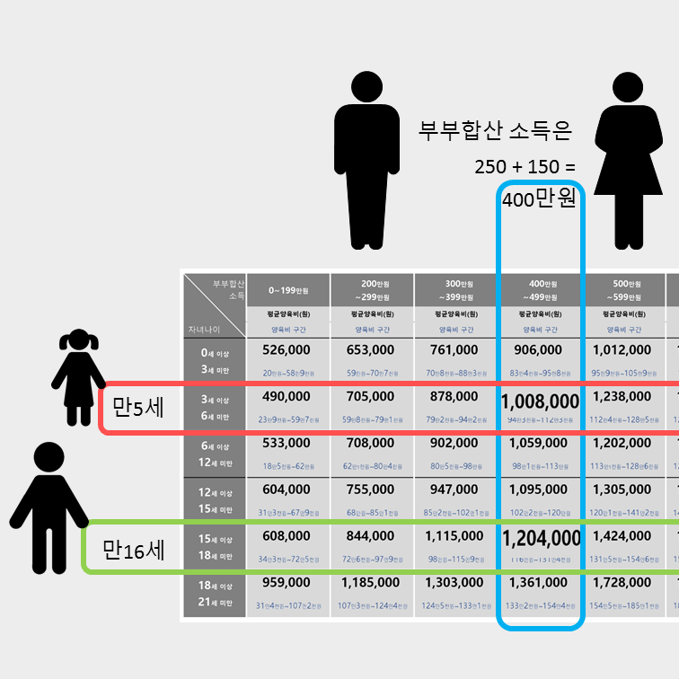 2. 산정기준표의 세로축은 자녀의 나이 구간을 나타냅니다. 산정기준표의 표준양육비는 우리나라에서 약 50% 가량을 차지하고 있는 양육자녀 2명인 가구(4명 가구)를 기준으로 한 자녀 1명당 평균양육비를 나타냅니다.