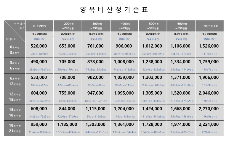 서울가정법원은 부모의 소득과 자녀의 나이를 고려하여 양육비산정기준표를 만들어 공고하고, 양육비를 산정함에 있어서 기준으로 활용하고 있습니다.