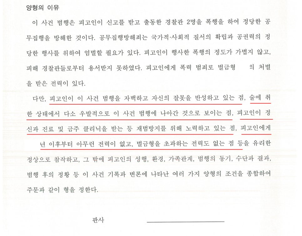 이에 저는 A씨에게 반성문, 탄원서, 정신과 진료 내역서, 음주 관련 교육 이수 등 여러 양형자료를 요청드린 뒤, 이를 바탕으로 A씨는 이 사건 당시 만취해 기억이 제대로 없는 상황에서 다소 우발적으로 이 사건 범행을 저지르게 되었다는 점, A씨는 이 사건 범행을 저지른 점에 대해서 진심으로 반성하고 있다는 점, A씨는 피해 경찰관들로부터 용서를 구하기 위해서 여러 차례 피해 경찰관들을 찾아뵙고 사죄를 드렸다는 점, A씨는 정신과 진료 및 금주 클리닉을 받는 등 재범을 저지르지 않기 위해서 최선을 다하고 있다는 점 등을 적극적으로 어필하며 '이번에 한하여 마지막으로 벌금형을 선고해 달라'는 내용의 변호인의견서를 제출하였으며, A씨에 대한 피고인신문을 진행하여 재판부에 위 내용을 적극적으로 어필하였습니다.