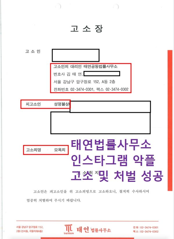 [태연법률사무소에서 진행한 인스타그램 악플러 고소 사건. 사건 고소장 일부 ]