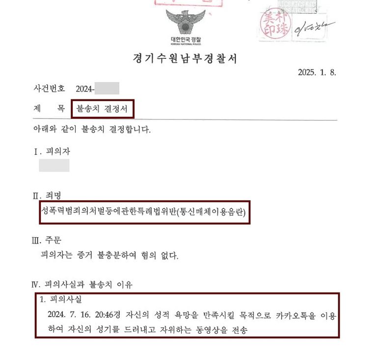 의뢰인은 2024 . 7. 16. 평소 알고 지내던 지인에게 "카카오톡을 이용하여 자신의 성기를 드러내고 자위하는 동영상을 전송하였다."라는 이유로 통신매체이용음란죄로 고소되었습니다.
