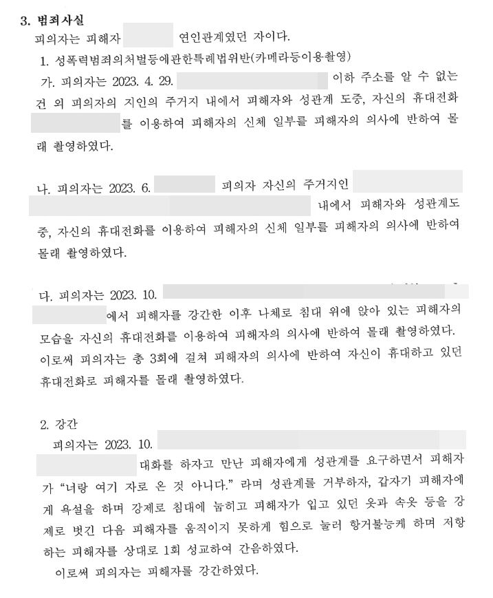 가. 의뢰인은 전 연인이었던 고소인과 여러 문제로 다툰 후 헤어지게 되었는데, 몇 달 후 의뢰인이 고소인의 나체를 몰래 촬영하고 원하지 않음에도 성관계를 하는 등 강간을 하였다며 의뢰인을 성폭력범죄의처벌등에관한특례법위반(카메라등이용촬영)과 강간 혐의로 고소하였습니다.