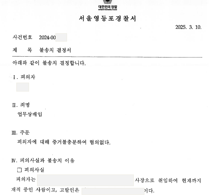 최근(2025. 3. 10.) 서울영등포경찰서로부터 의뢰인(피의자)의 업무상배임 사건에 대해 불송치(혐의없음) 처분을 받은 성공사례가 있어 이를 공유하고자 합니다.