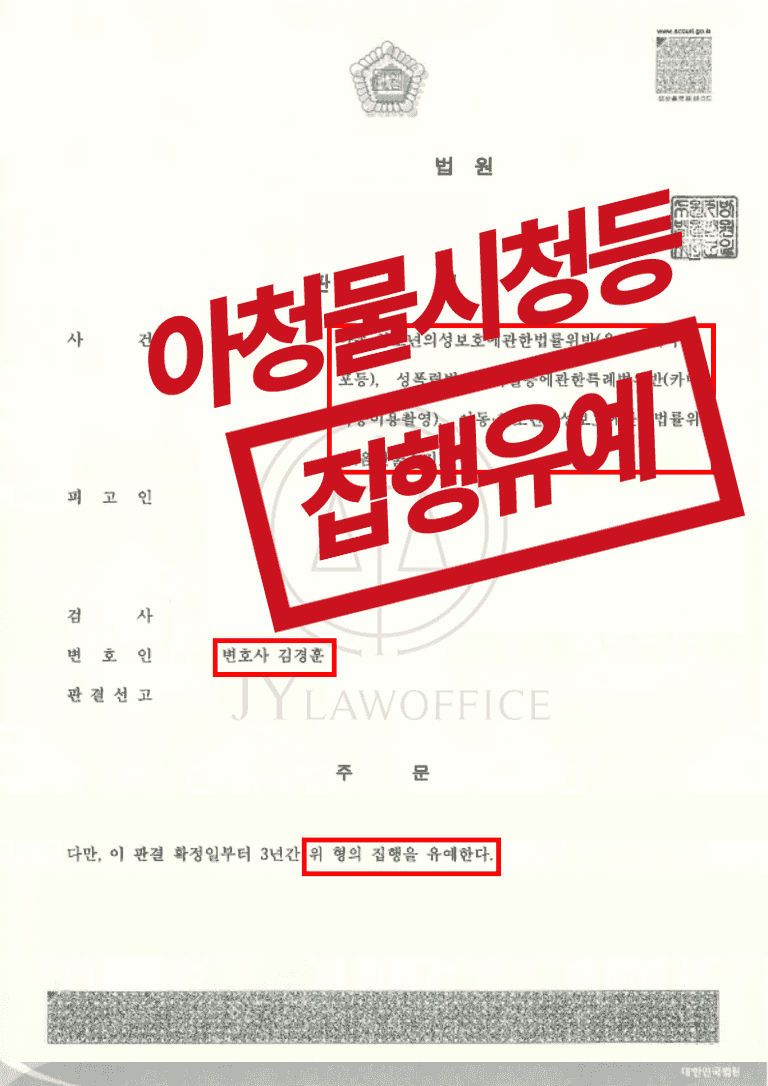 이와 같은 아청법변호사의 노력에 따라, 의뢰인은 아청물 시청, 아청물 소지 및 구매, 아청물 유포 등의 범죄 혐의에서 집행유예 판결을 선고받고 사건을 무사히 종결시킬 수 있었습니다.