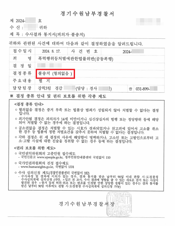 의뢰인 3명 모두 경찰에서 불송치 결정 후 최종 기록반환 종결되었습니다.