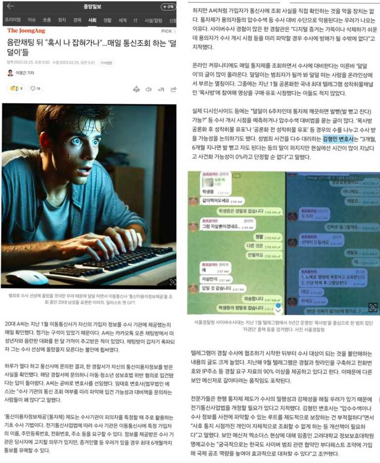 중앙일보에 통신자료 제공내역 조회, 통자제와 관련하여 자문을 하였습니다.