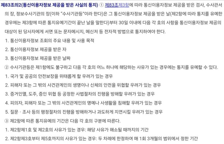 전기통신사업법에 나온 내용입니다. 제공받은 날로부터 30일 이내이고 3개월씩 2번 연장이 가능하기 때문에 총 7개월이 지나면 문자 등으로 통지를 해주어야 합니다. 윤XXX와 관련하여서 8월 30일에 통신이용자정보 제공받은 사실통지를 문자로 받은 이후 12월 18일에 압수수색이 나온 경우도 있었습니다. 재밌는 것은 문자로 통보까지 받았다면 위험성이 어느 정도 있는 것인데 가선임까지 문의한 이후(노쇼하였음) 정작 압수수색이 이루어졌을 때 해당 음란물이 그대로 압수되었다는 것입니다. 문자로 통보된 경우는 수사 안 이루어질 것이라는 썰들이 좀 있는 것 같고 그 썰을 백프로 믿지 않았다고 하더라도 4개월 정도 지났기 때문에 지나갔다고 생각했기 때문이 아닌가 싶습니다. 저에게 문의까지 했고 어느 정도 위험성이 있다는 답변을 받은 경우라면, 압수수색을 받더라도 나올 것이 없지 않을까 생각하기 쉬우나 제 입장에서 이런 일은 흔히 볼 수 있습니다.