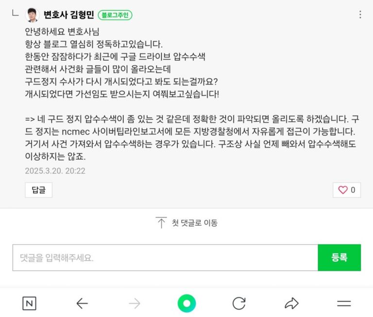 사건화 글이 많다는 위 블로그 문의 외에 로톡 전화상담 및 로톡을 통하지 않은 문의가 있었습니다. 사건화된 글이 많이 올라온다는 문의들이 있어서 구드 정지 압수수색이 좀 있는 것 같다고 생각을 했고 제가 압수수색 영장 사본을 확보해서 구체적으로 파악이 되면 포스팅할 생각이었습니다. 그러나 영장 사본을 첨부한 실제 구글드라이브 정지, 구드 정지로 압수수색 당한 사람의 문의는 없었습니다. 특정 경찰청에서 구글드라이브 정지, 구드 정지로 압수수색을 스타트 하게 되면 보통 10명 이상, 20명 정도는 됩니다. 10명이 압수수색을 당하면 평균 3명 정도는 저에게 문의를 하는 것이 보통이라고 판단하고 있는데 실제 구글드라이브 정지, 구드 정지 수사가 본격적으로 개시 되었는지 현재로서 저는 잘 모르겠다는 입장입니다. 문의한 분들에게 물어보니 성전카페에 글이 있다는 말을 들었는데 제가 구체적으로 확보하고 있는 것이 없으니 그곳에 물어보는 것이 좋지 않을까 싶습니다. 신빙성에 관한 말들이 있는 것 같기는 하나 제가 대한민국의 디지털 성범죄 관련 모든 압수수색을 파악하고 있지는 않기 때문에 제가 놓쳤을 수도 있을 것입니다.