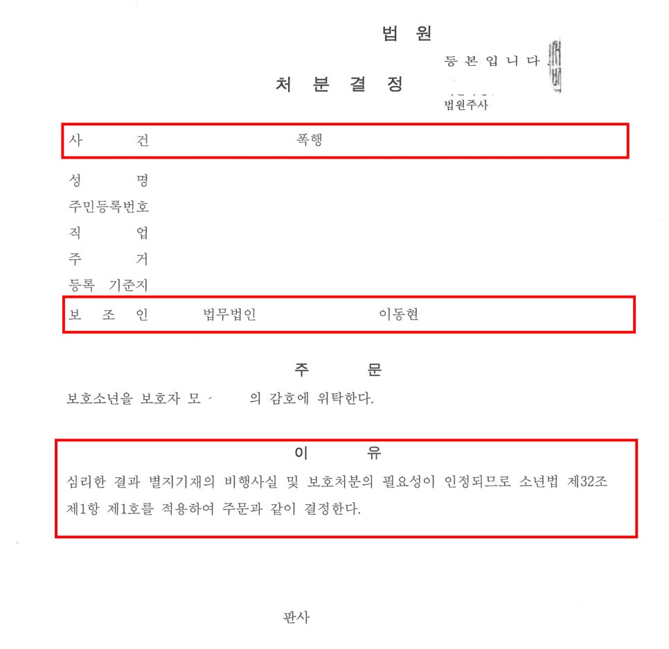 이번 포스팅에서는 폭행 혐의를 받은 학생이 소년부 재판을 받게 되었으나, "1호 처분"(서면사과)으로 마무리된 실제 성공 사례를 소개하겠습니다.