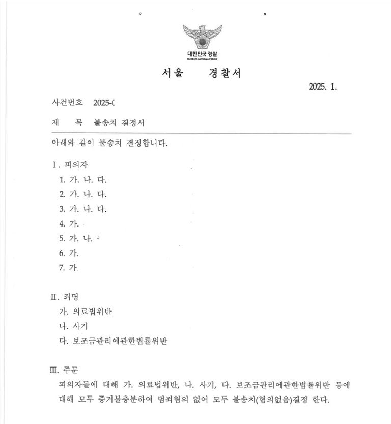 경찰은 변호인의 의견을 적극 수용하여 의료법위반, 사기, 보조금관리에관한법률위반 등 모든 혐의에 대해 불송치(혐의없음) 처분을 내렸습니다.