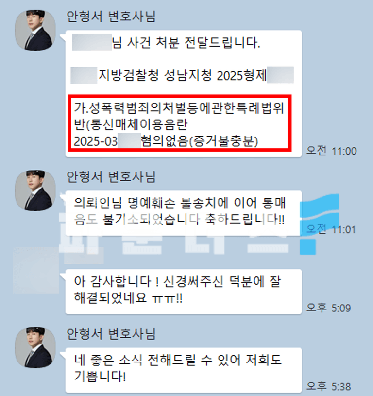 마지막으로 변호인의견서 작성을 통해 구체적인 사실관계를 기반으로 의뢰인의 통매음 혐의에 대한 혐의없음을 주장하며 사건이 마무리되는 순간까지 적극적인 도움을 드렸습니다.