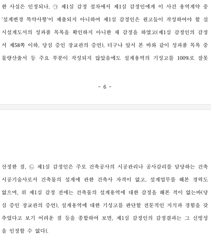 위 세가지 질문에서 감정인은 '1) 이 사건 계약서와 표준 계약서가 다르다는 사실은 알았지만, 2) 특약사항은 보지 못하고 감정을 진행했으며, 3) 본인은 건축시공기술사 자격만 있을 뿐 건축사 자격이 없고 설계 업무는 해본 적이 없다'고 답변했습니다. 특히 '특약사항은 보지 못하고 감정을 진행'했다는 말에 재판부는 크게 놀라 몇번이고 이부분을 다시 질문하기도 했습니다.