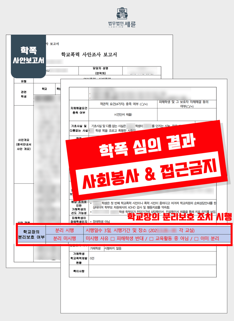해당 사안에서는 학교장의 분리보호가 이루어졌습니다. 피해학생과 가해학생의 분리를 통해 피해학생의 심리적 불안감을 해소, ▲고조된 갈등을 완화하고 ▲2차 피해를 방지할 수 있습니다. 따라서 학교 측이 필요하다고 인지한 순간 '즉시' 해당 조치를 취해준다면 보다 빠르게 사건을 마무리할 수 있겠습니다.