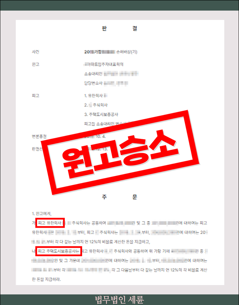 🚨 법무법인 세륜은 10년 경력의 대한변협등록 민사전문 변호사가 상담부터 재판 끝까지 책임지고 전담하고 있습니다. 아파트 공용부분하자 손해배상 분쟁과 관련된 법무법인 세륜의 실제 해결사례를 소개합니다.