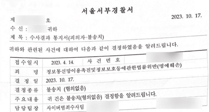 학교폭력 폭로 명예훼손 불송치(무혐의)