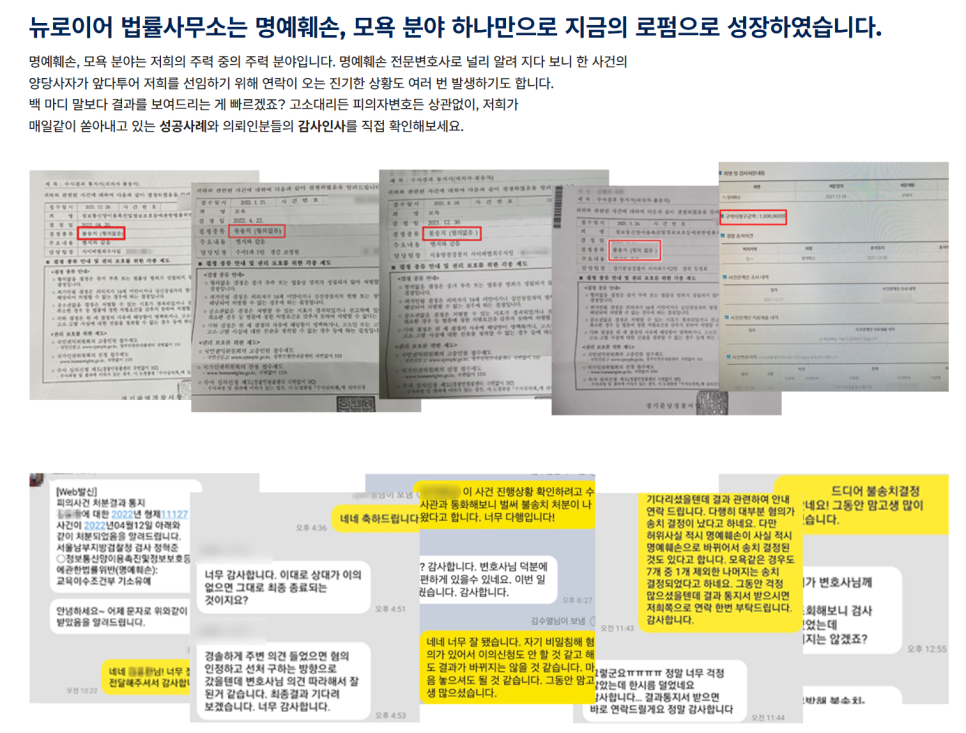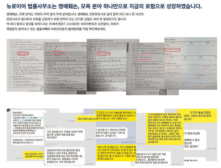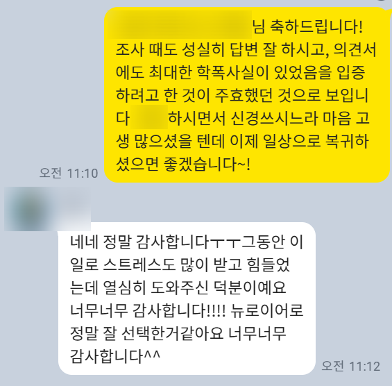의뢰인분은 괜히 '학교폭력 피해자'에서 '명예훼손 가해자'가 될까봐 억울하고 불안했는데 사건 잘 해결되고 학교폭력이 수사기관에서나마 인정받았다는 생각에 위로를 받았다고 말씀주셨습니다.