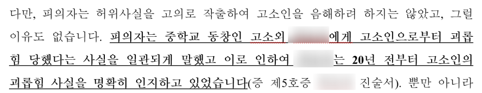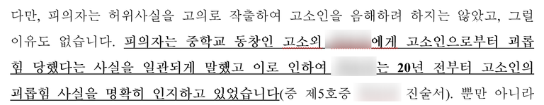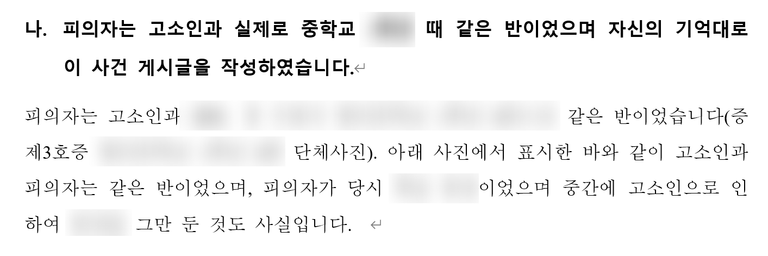 이를 토대로 저희는 변호인의견서에서 치밀하게 의뢰인분과 상대방은 실제로 중학교 같은 반이었고 있지도 않은 학교폭력 피해를 지어낼 리도 없으며 폭로글은 사실에 기반한 내용임을 적극 주장하였습니다.