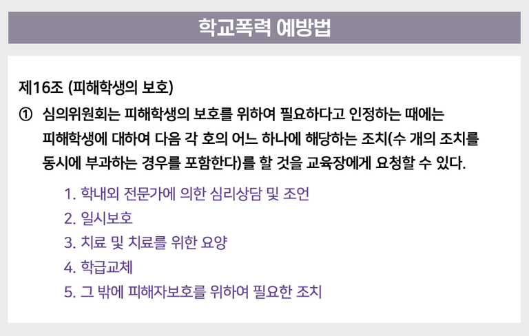 피해학생에게 학폭에 대한 기억은 오랜 기간 트라우마로 남게 되는 경우가 많기 때문에 심리상담이나 심리치료를 적극적으로 조치하고 있습니다.