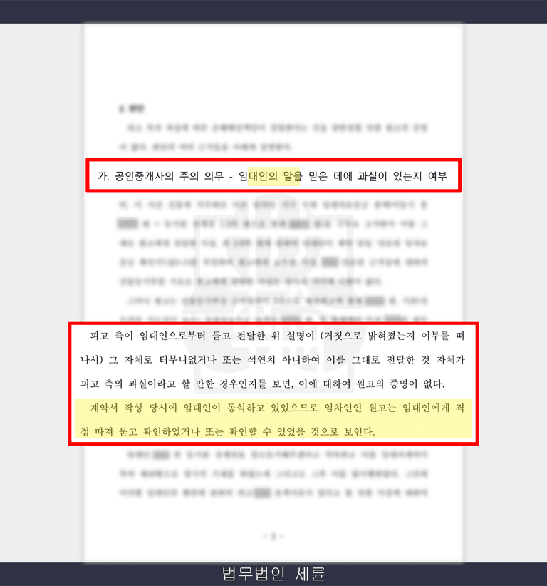 우리의 의뢰인 피고의 경우 원고에게 직접 서류를 확인해주는 절차를 생략하고 임대인으로부터 들은 내용만 전달한 것이 문제될 수 있었습니다.