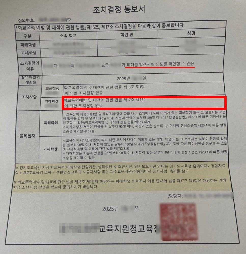 결국 이러한 주장을 받아들여, 학교폭력대책심의위원회는 "조치결정 없음"을 내렸습니다.