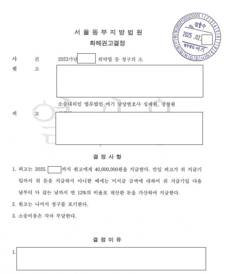 저는 소송 과정에서 영업비밀이 문제가 된 것이 아니고, 단순하게 동종의 영업을 하는 것이 위약벌의 근거라고 주장을 하였고, 재판부에서는 위약벌이 너무크니 적절한 금액으로 화해권고를 하였습니다. 당사자는 고민을 하다가 화해권고 결정을 받아들였습니다.