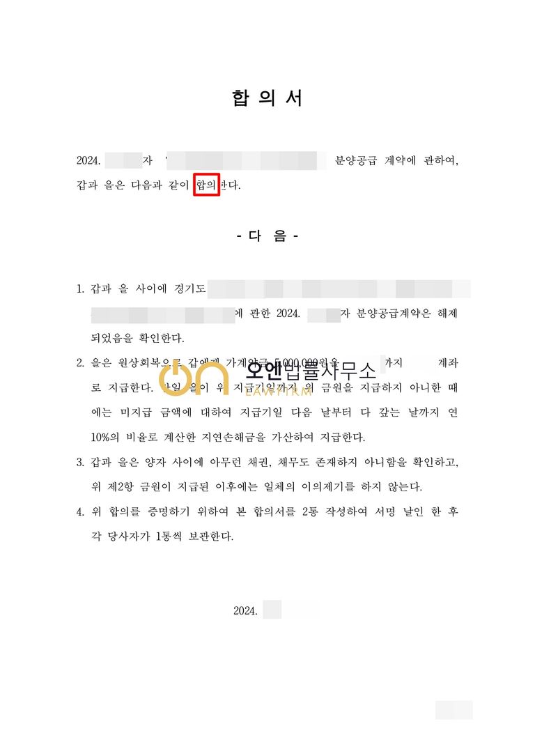상대방 회사는 소장을 송달받은 이후 담당 변호사에게 합의 연락을 하였고, 쌍방은 소취하합의를 하여 의뢰인은 가계약금 500만 원을 모두 반환받았습니다.