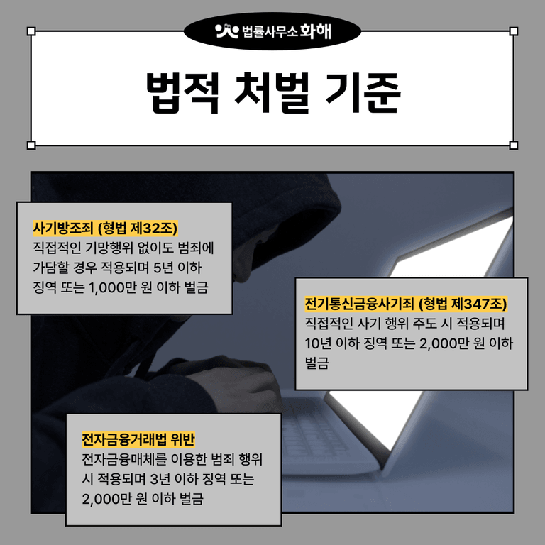 이 경우 가해자는 전자금융거래법 제49조에 따라 3년 이하의 징역 또는 2,000만 원 이하의 벌금형까지 처하는 것이 가능합니다. 만일 이러한 행위가 드러난다면 방조 혐의와 함께 적용되어 형량이 올라갈 수 있습니다.