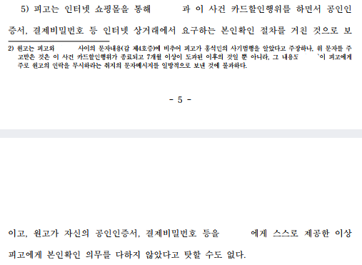 가. 손해배상청구와 관련하여, 재판부는 1) B가 입은 손해는 A의 사기범행으로 인한 것이지 의뢰인의 카드할인행위로 발생하였다고 볼 수 없고, 2) A와 의뢰인이 ’인0파0 사이트‘를 통해 거래하는 과정에서 해당 사이트의 시스템을 통해 본인확인 등이 이루어졌기에, 의뢰인이 카드명의인과 사용자가 다르다는 사실을 인식할 수도 없었다고 보아 피해자 B의 손해배상청구 전부를 기각하였습니다.