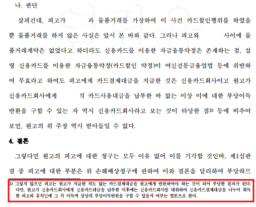 나. 부당이득반환청구와 관련하여, 재판부는 1) 의뢰인에게 카드결제대금을 지급한 것은 카드회사이라 부당이득반환청구를 할 수 있는 것은 카드회사로 보아야 하고, 2) 의뢰인과 A사이 자금융통약정 (카드할인행위에 관한 약정)이 있기에 의뢰인이 카드할인행위를 통해 취득한 이익이 법률상 원인이 없다고 볼 수도 없다고 판단하였습니다.