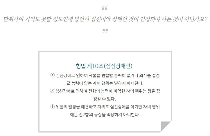 형법 제10조는 위와 같이 심신장애로 인하여 정상적인 상태가 아닌 상태에서 해당 행위를 하는 경우에 관하여 규정하고 있으나, 실무상 만취하였음만을 이유로 형법 제10조에 따른 감경을 인정받는 것은 쉽지 않습니다.