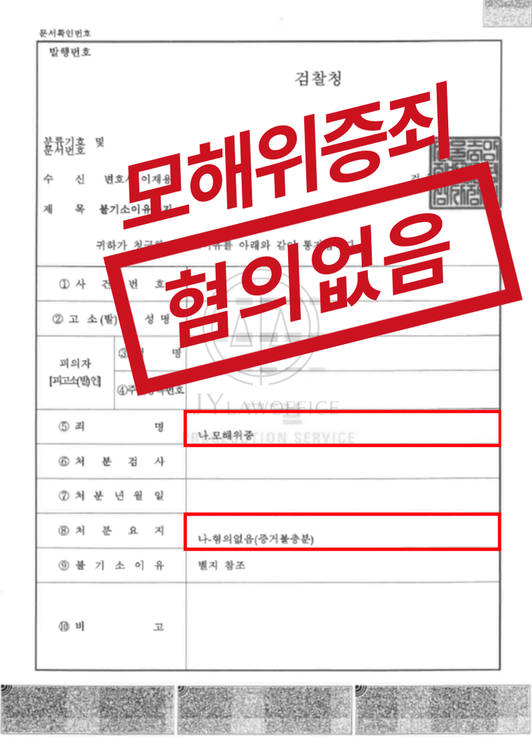 이와 같은 본 형사전문변호사의 조력으로 의뢰인은 모해위증죄 혐의에 대해 혐의 없음의 처분을 받고 위증죄 처벌을 피하며 무사히 사건을 종결시킬 수 있었습니다.