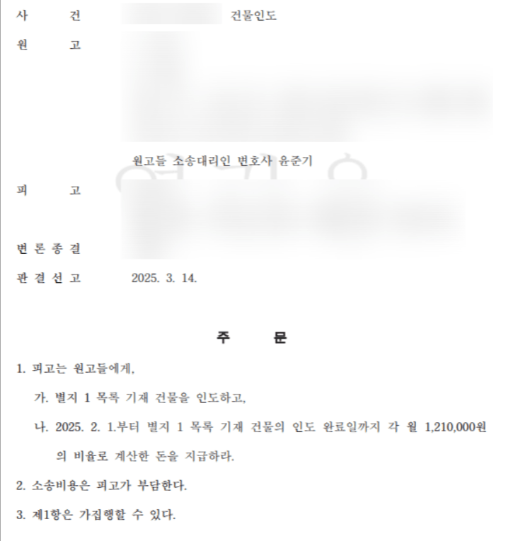 법률사무소 새율이 청구한 내용 그대로 전부 승소하였습니다. 현재는 상가 인도 강제집행과 미납된 임대료 청구를 위해 피고의 부동산 등에 대한 강제집행 절차를 진행하고 있습니다.