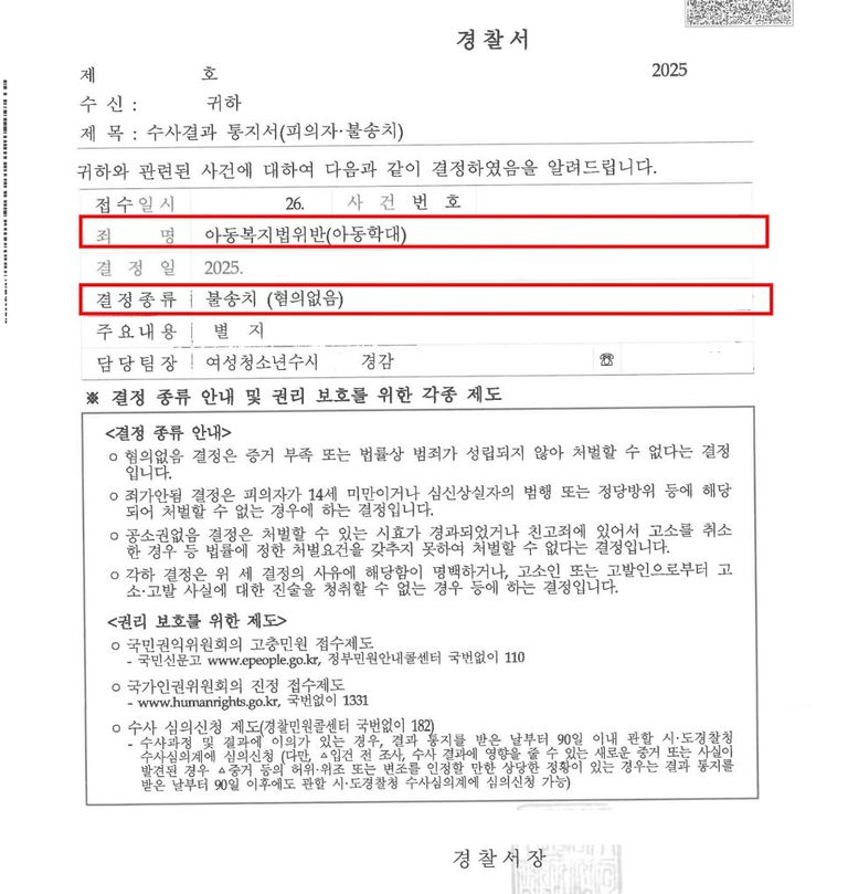 결국 이러한 주장을 받아들여, 경찰은 '혐의없음' 불송치 결정을 내렸습니다.