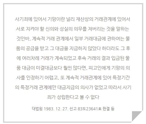 구체적으로 예를 들어 설명하면, 당근마켓에서 중고 물건을 거래하였으나 물건을 받았음에도 대금을 지급하지 않는다면 대금을 지급하지 아니한 특별한 이유가 없다면 사기죄가 성립합니다. 그러나, 회사에서 제품을 생산하기 위한 원재료를 공급 받는 업체가 있고, 해당 업체와 지속적으로 해당 원재료를 공급 받고, 대금을 지급하는 경우를 계속적 거래 관계라고 하고, 이러한 경우 위 판결에서 보는 것과 같이 별도의 기준으로 판단한다는 것입니다.