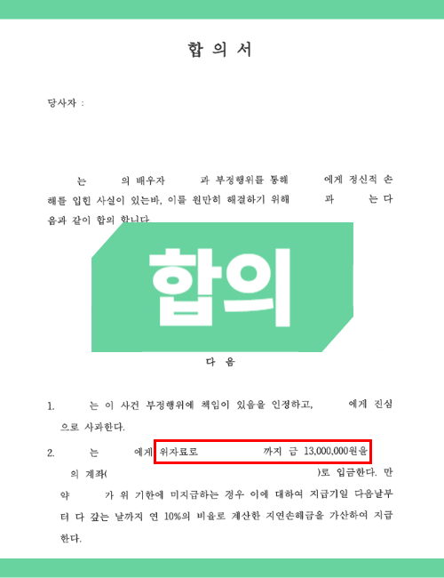 하지만 합의가 항상 쉬운 것은 아닙니다. 상대 배우자가 감정적으로 흥분한 상태라면 과도한 합의금을 요구 할 수도 있습니다. 이런 경우 변호사의 조력을 받아 적정한 합의금 조율 이 필요합니다.