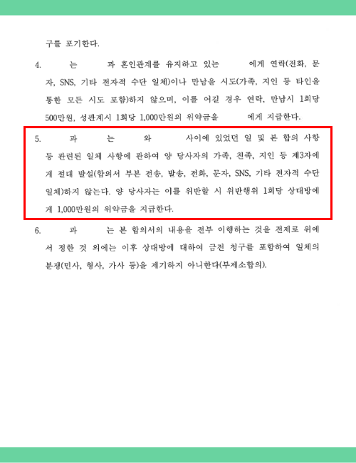 ✔ 이후 상대 배우자와의 추가 분쟁을 방지하기 위해 비밀 유지 조항 및 명예훼손 방지 조항 포함