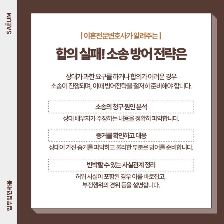 합의가 어렵거나 상대방이 비현실적인 요구를 한다면, 소송으로 가야 합니다. 이 경우 상간녀 방어 전략 을 철저히 준비해야 합니다.