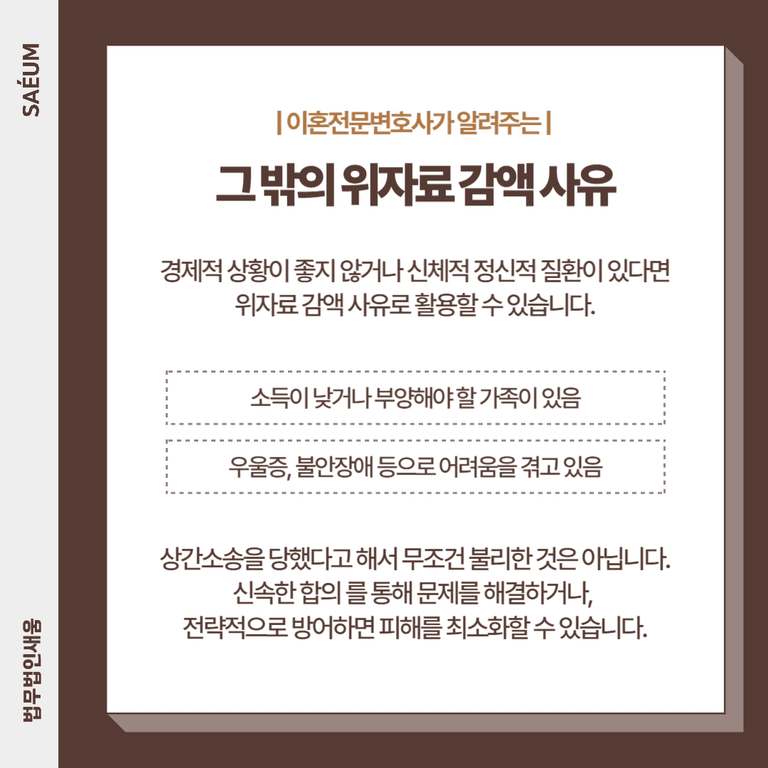 경제적 상황이 좋지 않거나 신체·정신적 질환이 있는 경우, 위자료 감경 사유 로 활용할 수 있습니다.