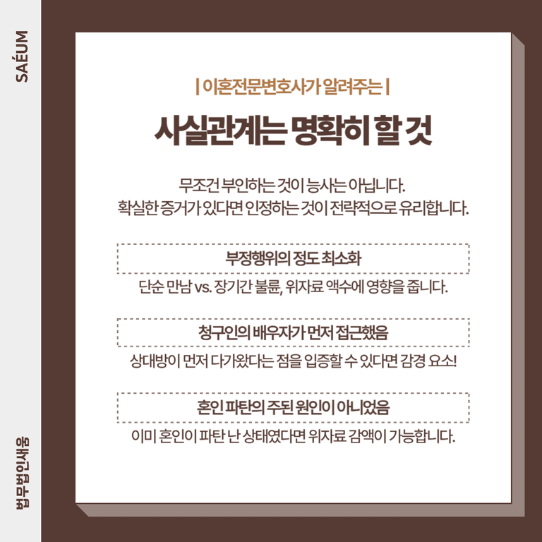✔ 청구인의 배우자가 먼저 접근했음 – 상대방이 먼저 다가왔다는 점을 입증할 수 있다면 감경 요소가 될 수 있습니다.
